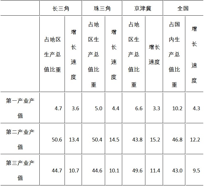 2010年三大經(jīng)濟(jì)圈產(chǎn)業(yè)結(jié)構(gòu)及增長(zhǎng)速度(%)